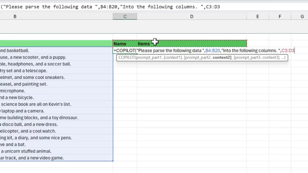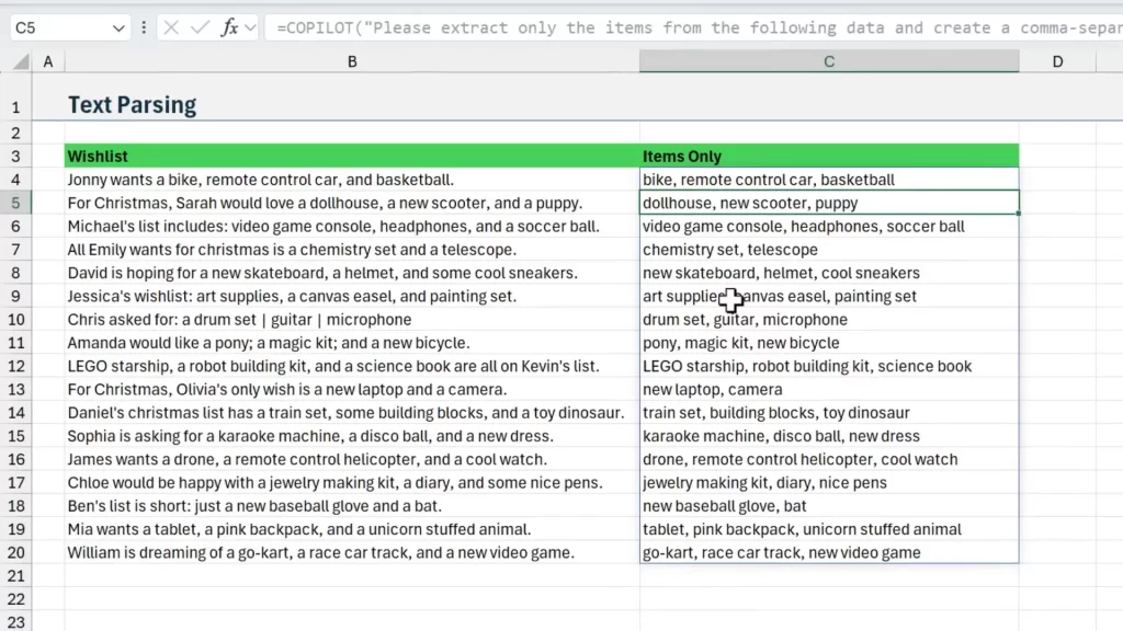 One of the first things I tried was parsing messy lists. The COPILOT Function in Excel is excellent at extracting items separated by inconsistent characters.