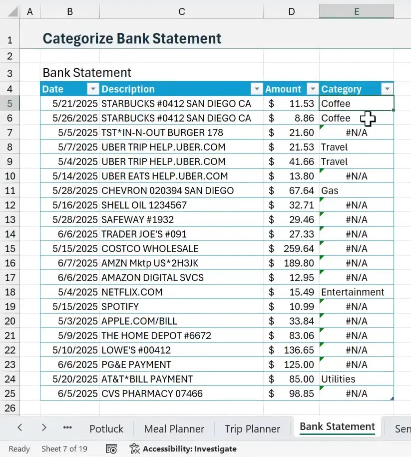 Bank statements often have inconsistent descriptions. Use COPILOT to assign categories for uncategorized items. Pair it with XLOOKUP and FILTER to create an efficient pipeline.