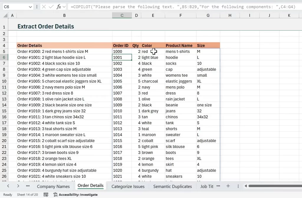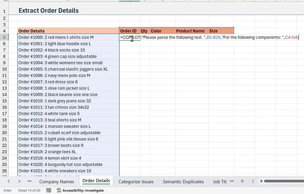 Orders often contain product, color, size, and quantity in one cell. COPILOT can parse those into separate columns.