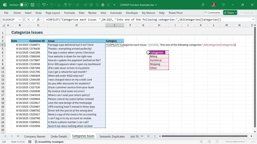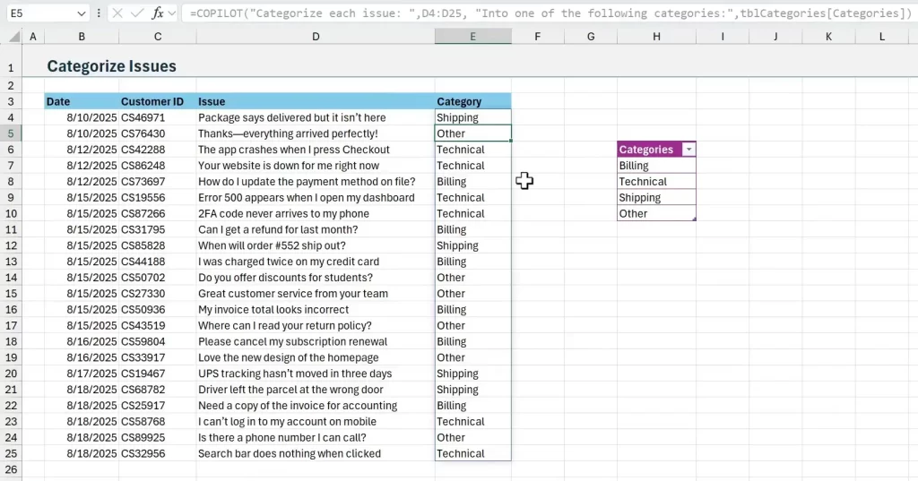 Customer support tickets are messy. Use the COPILOT Function in Excel to assign each ticket to one of your predefined categories.