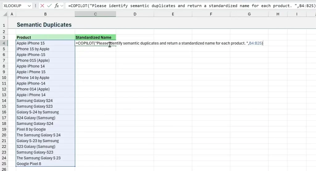 This is critical when product analytics depend on consistent naming. The COPILOT Function in Excel understands context and human variations.