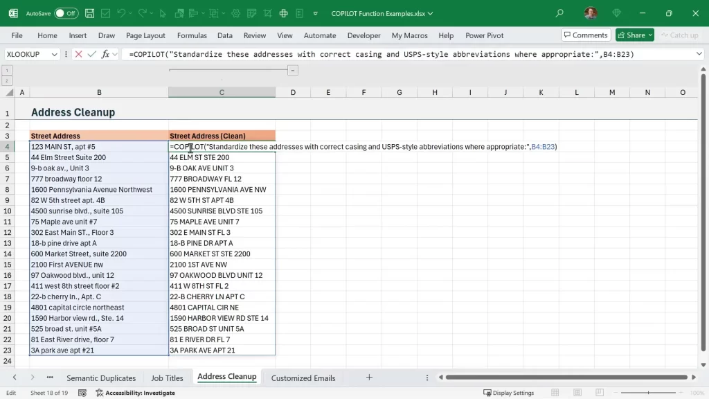 My recommendation is to start small. Try it on a unique list or a single cleanup task. Learn prompt patterns and then scale. The COPILOT Function in Excel is best used as an augmentation to your existing formulas and processes.