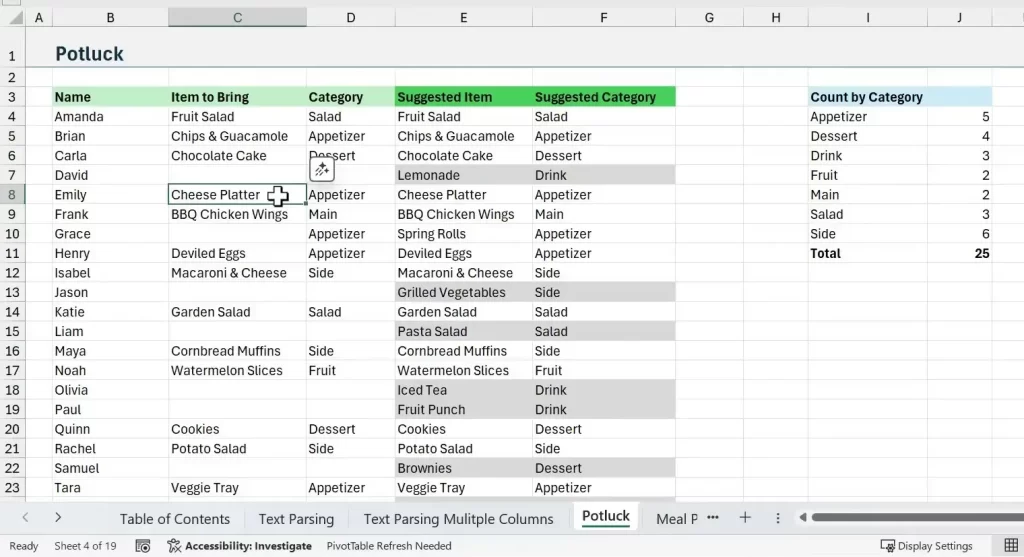 Potlucks are a fun test case. They reveal how AI can balance categories and fill gaps. Use the COPILOT Function in Excel to categorize signups and recommend missing dishes.