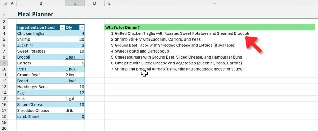 - Write a prompt: “Please give me a list of seven meals based on the following ingredients. If quantity is zero, assume the item is unavailable.”
