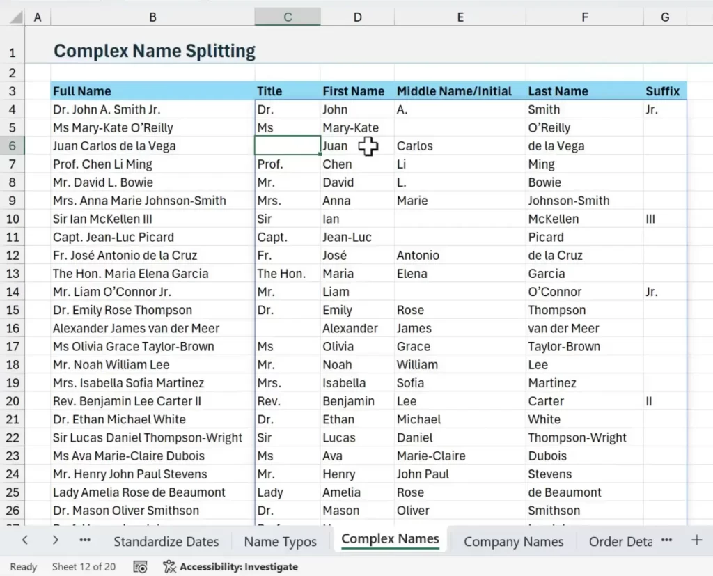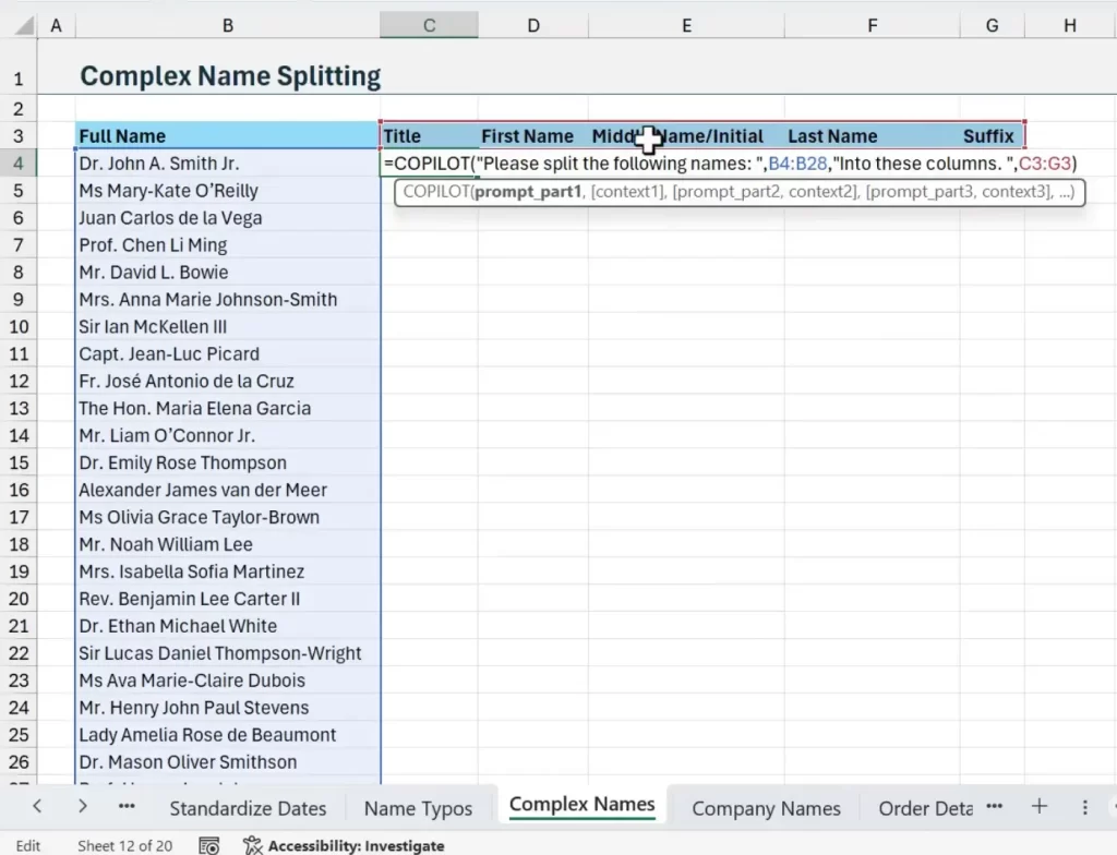 Splitting full names into title, first, middle, and last is a classic headache. The COPILOT Function in Excel handles diverse formats well.