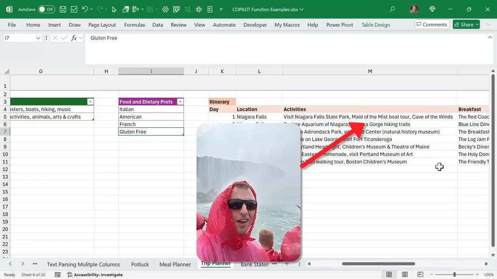 The result is a day-by-day table with activities and meal suggestions. It’s dynamic. Change preferences and the COPILOT Function in Excel updates the plan.