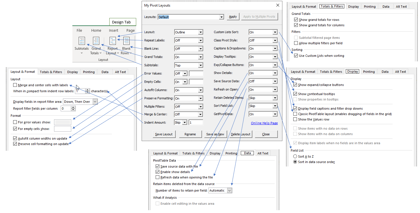 The nice part is that you can create as many custom layouts as you like. Some pivot tables you might want to format to look like a financial report, other times you might want it to look like a tabular format with repeating labels. These layouts can all be saved and applied anytime with this feature.